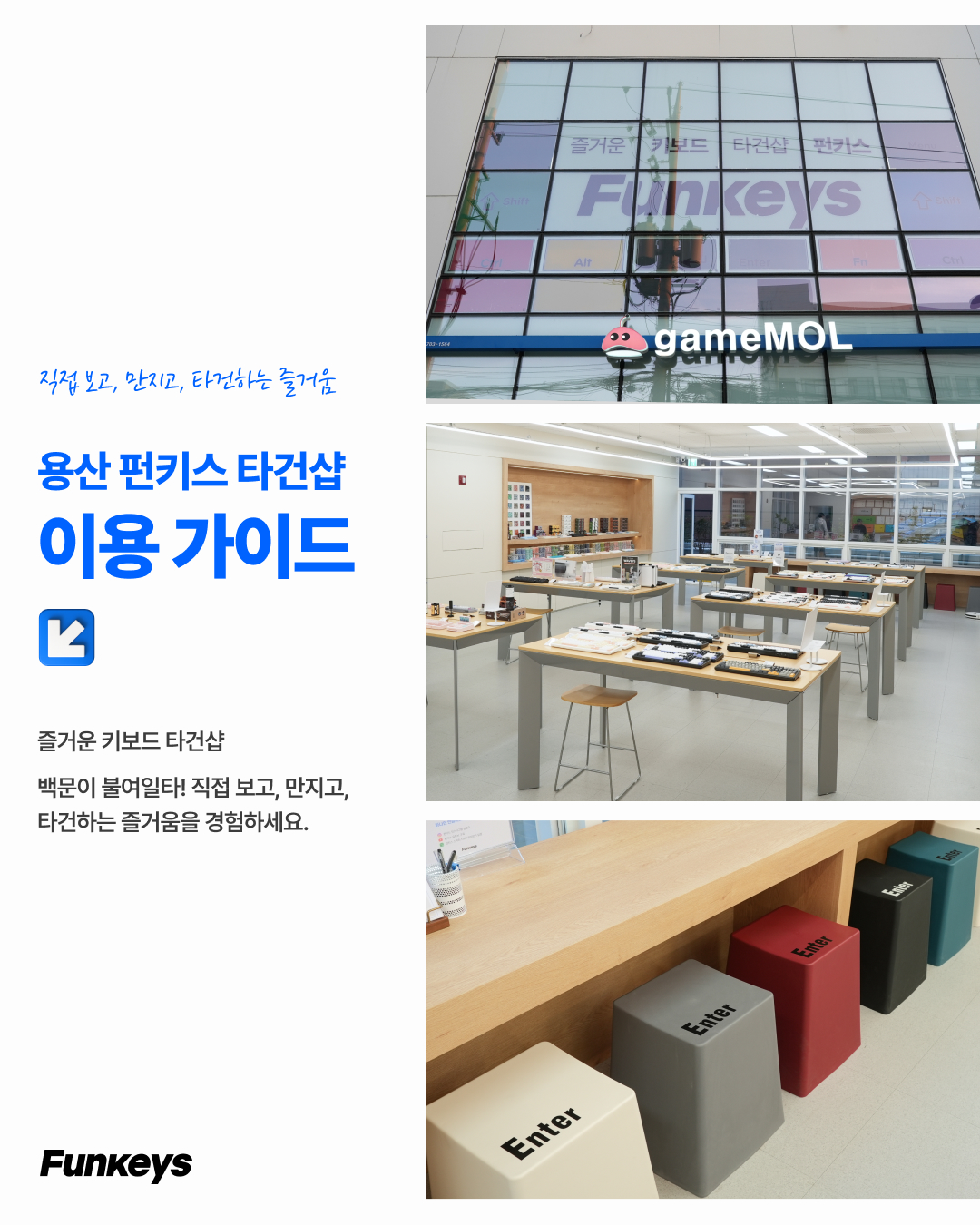 용산 펀키스 타건샵에서는 AULA, VARMILO, FL-ESPORTS, DUCKY, LEOBOG, Dry Studio, Keydous, 80Retros, Luminkey, KoKokey, WLMouse, 일당오, 고스트저지, 아이페이, TTC, 카일(Kailh), TECSEE 등 펀키스에서 취급하는 다양한 제품은 물론, 아직 출시하지 않은 신제품들을 타건샵에서 미리 경험해 보실 수 있습니다.
