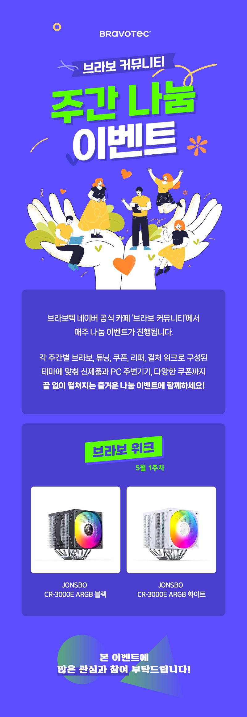 브라보텍 네이버 공식 카페 '브라보 커뮤니티'에서 진행되는 5월 1주차 나눔 이벤트 품목을 안내 드립니다.