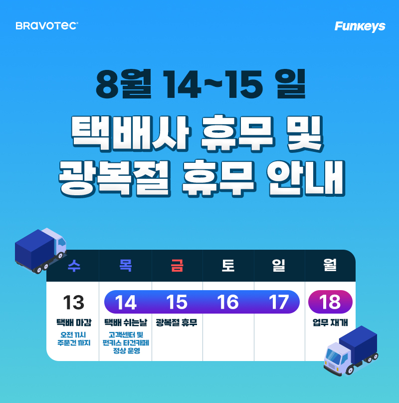 택배 쉬는날은 주문 제품 및 A/S 택배 발송이 중단되며, 광복절은 전화 및 택배, 방문 등 고객 지원 서비스와 펀키스 타건 카페 운영이 잠시 중단되오니 많은 양해를 부탁드립니다.