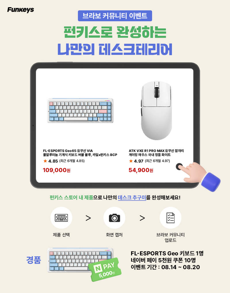 나만의 데스크테리어를 위해 꼭 필요한 키보드와 마우스를 펀키스 스마트스토어에서 골라 캡처한 후, [이벤트 참여 게시판]에 업로드해 주세요. 참여해 주신 분들 중 추첨을 통해 1분께는 FL-ESPORTS Geo 시리즈 키보드, 10분께는 네이버페이 5,000원 쿠폰을 선물로 드립니다.