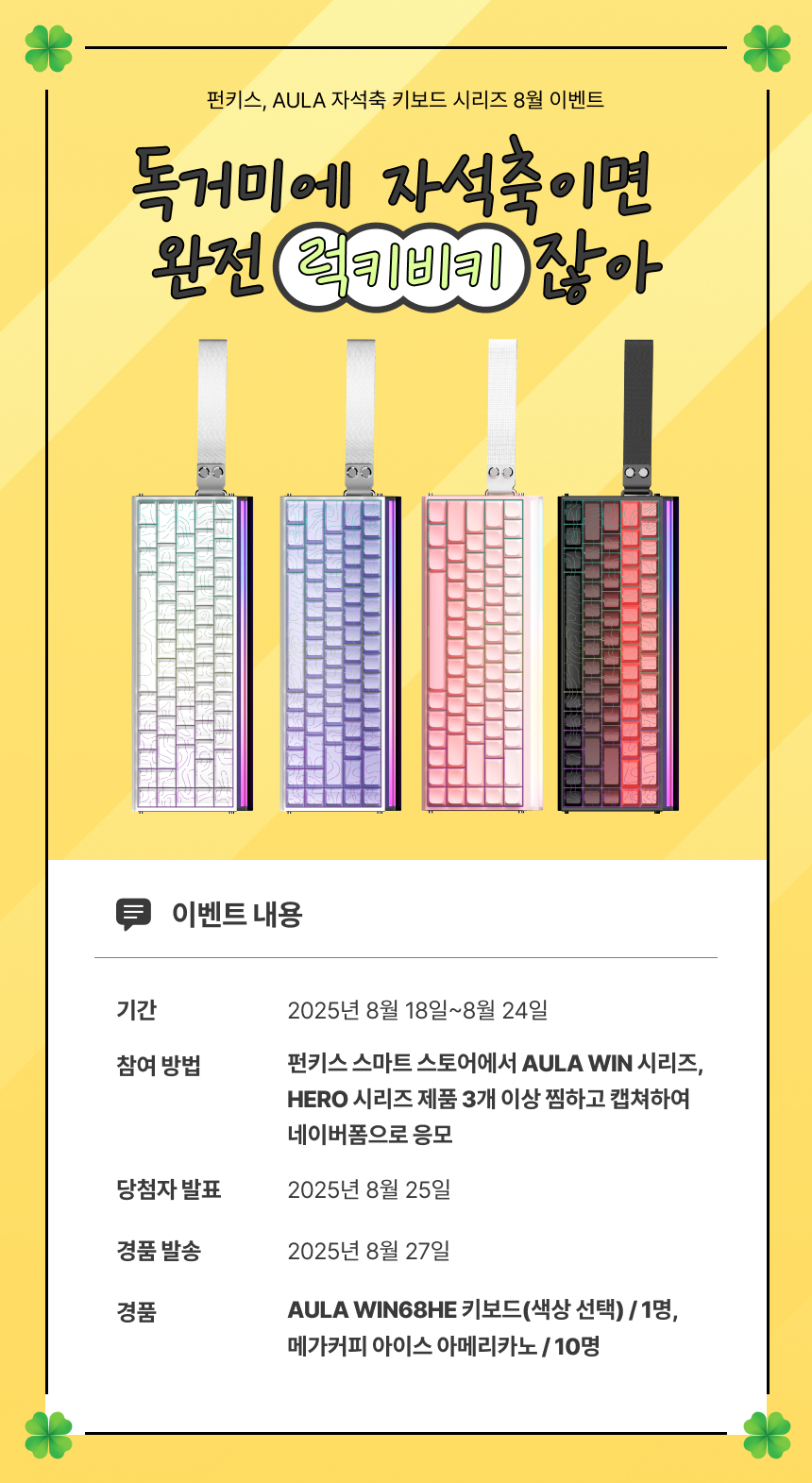 2025년 8월 18일부터 24일까지 펀키스, AULA 자석축 키보드 시리즈 8월 이벤트 ‘독거미에 자석축이면 완전 럭키비키잖아’ 가 진행됩니다.