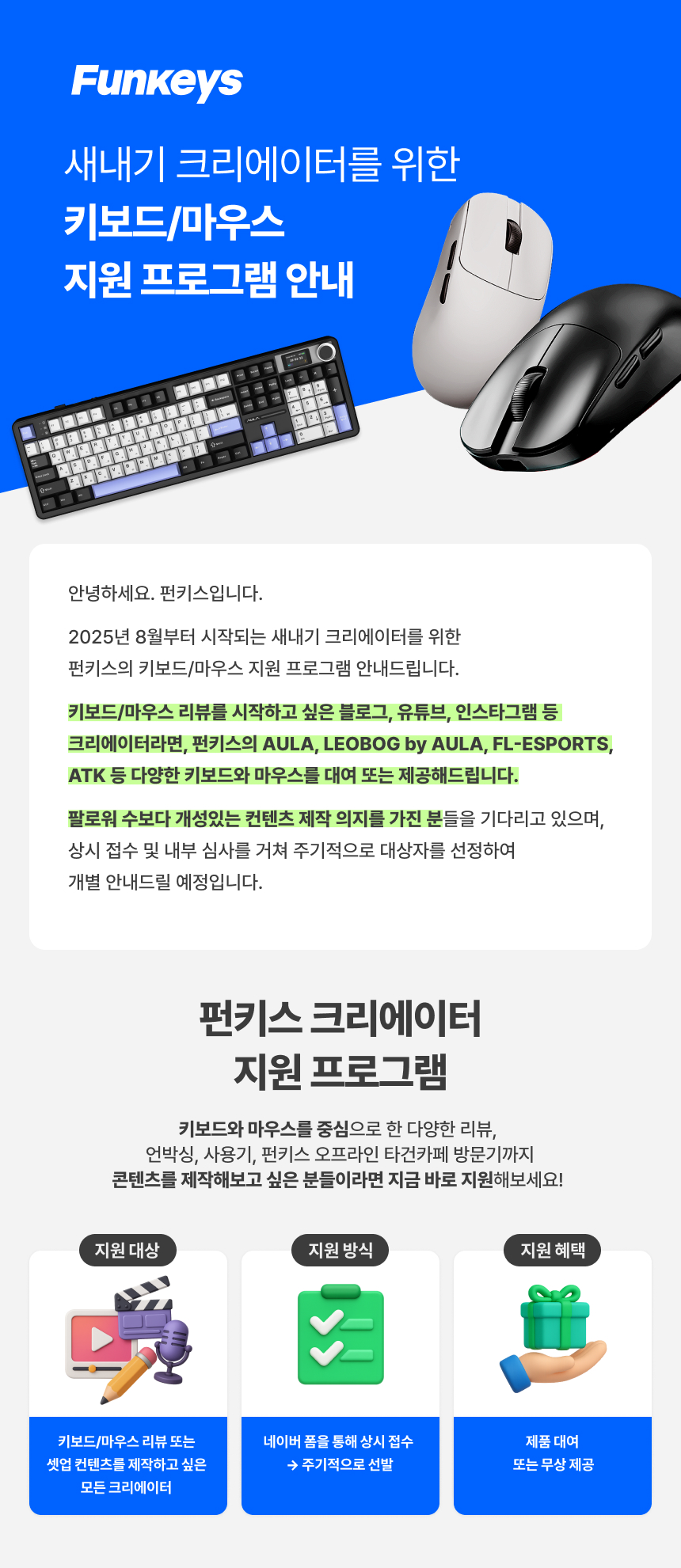 2025년 8월부터 시작되는 새내기 크리에이터를 위한 펀키스의 키보드/마우스 지원 프로그램 안내드립니다.