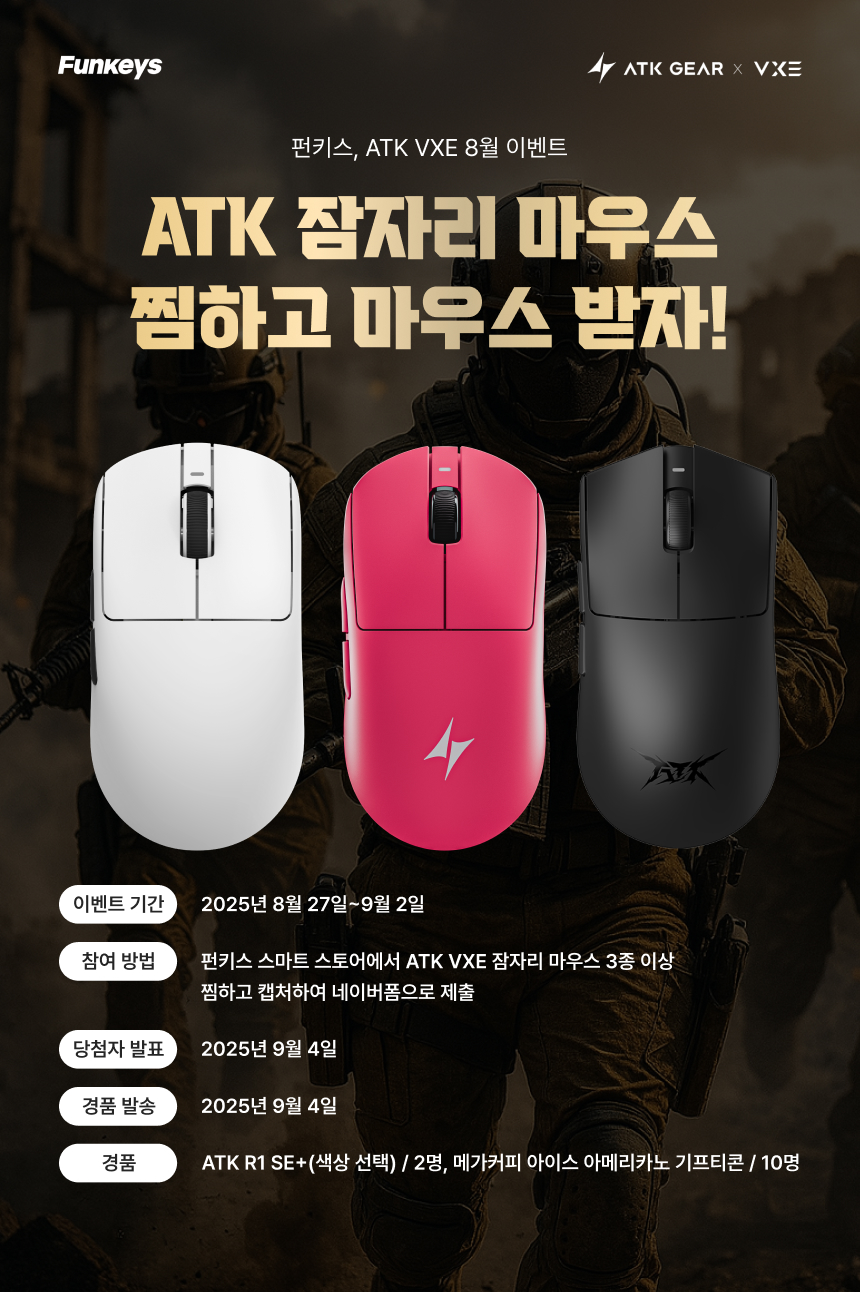 펀키스 스마트 스토어에서 ATK 잠자리 마우스 3종 이상 찜하고 캡처하여 네이버폼으로 제출해 주시면 추첨을 통해 2분께 ATK VXE R1 SE+ 마우스를, 10분께는 메가커피 아이스 아메리카노 기프티콘을 드립니다!