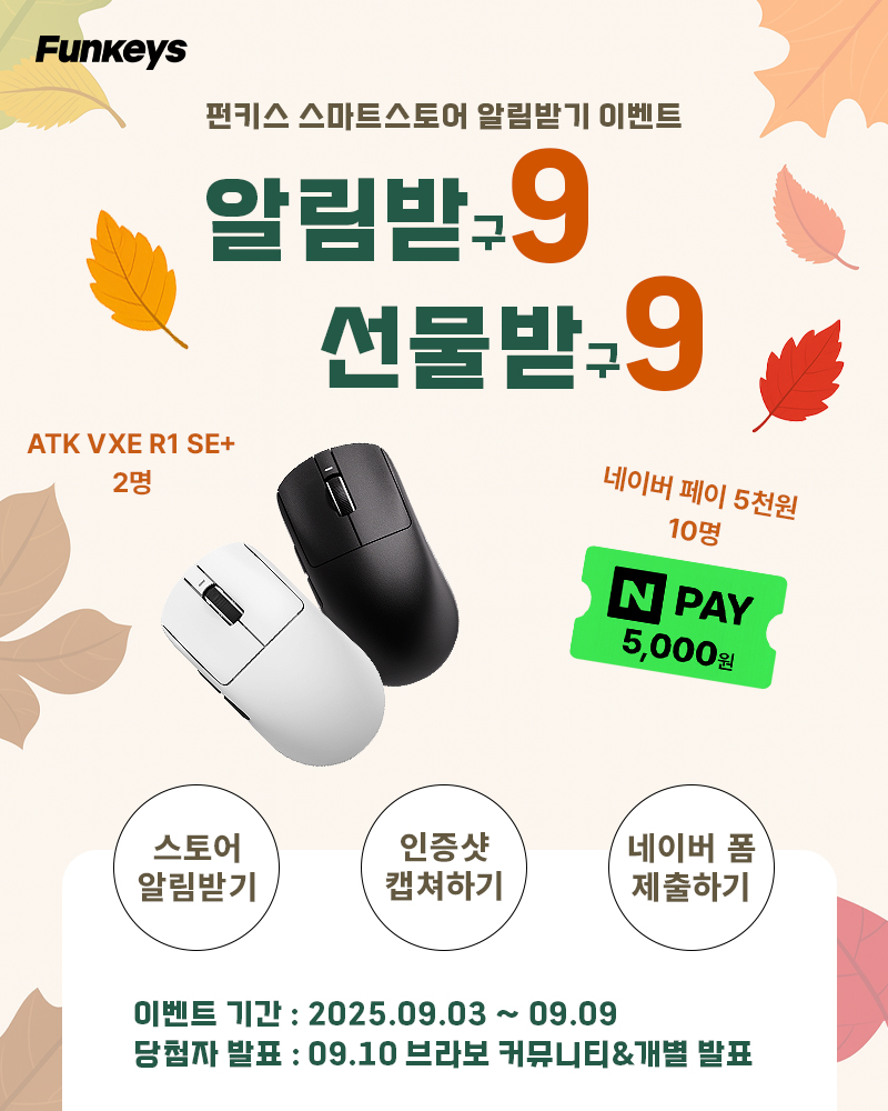 9월 3일부터 9월 9일까지, 펀키스 스마트스토어에서 ‘알림받기’ 설정 후 완료 화면을 네이버 폼에 제출해 주세요. 추첨을 통해 두 분께 잠자리 마우스 ATK VXE R1 SE+와 열 분께 네이버 페이 5천원 쿠폰을 선물로 드립니다!