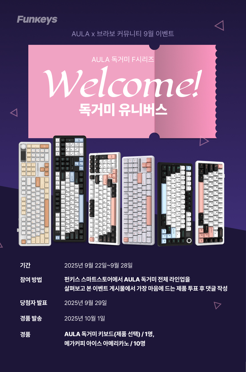 2025년 9월 22일부터 28일까지 진행했던 AULA x 브라보 커뮤니티 9월 이벤트 독거미 F시리즈 ‘웰컴 투 독거미 유니버스’ 당첨자를 발표합니다.