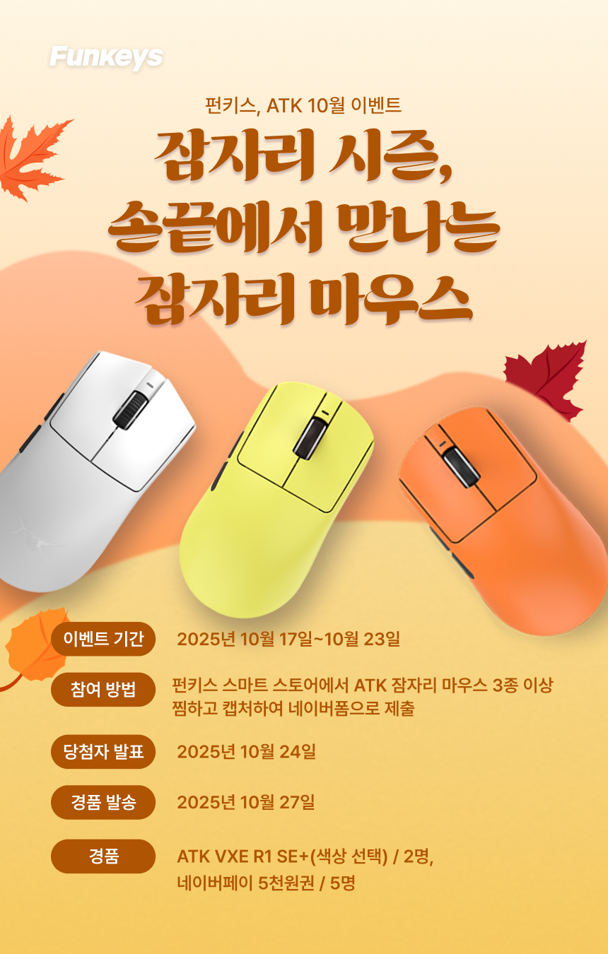 2025년 10월 17일부터 23일까지 진행했던 펀키스, ATK 10월 이벤트 ‘잠자리 시즌, 손끝에서 만나는 잠자리 마우스’ 당첨자를 발표합니다.