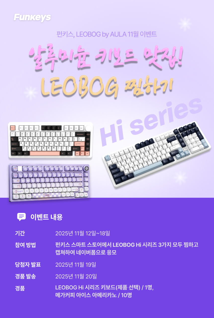 2025년 11월 12일부터 18일까지 펀키스, LEOBOG by AULA 11월 이벤트 Hi 시리즈 ‘알루미늄 키보드 맛집! LEOBOG 찜하기’ 가 진행됩니다.
