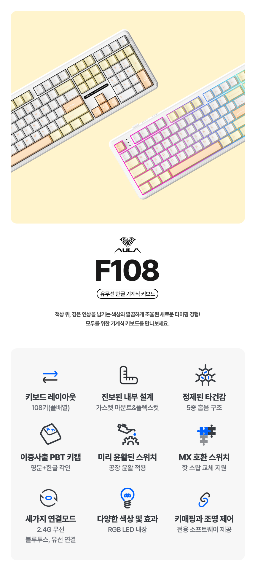 F108 유무선 시리즈는 풀사이즈 레이아웃이 적용된 108키 풀배열 기계식 키보드로 사무작업부터 게임까지 모든 환경에서 편리하게 사용가능한 모델이며, 코스트코 단독 모델은 치즈 화이트 색상에 LEOBOG 황축 V3 스위치가 탑재되었습니다.