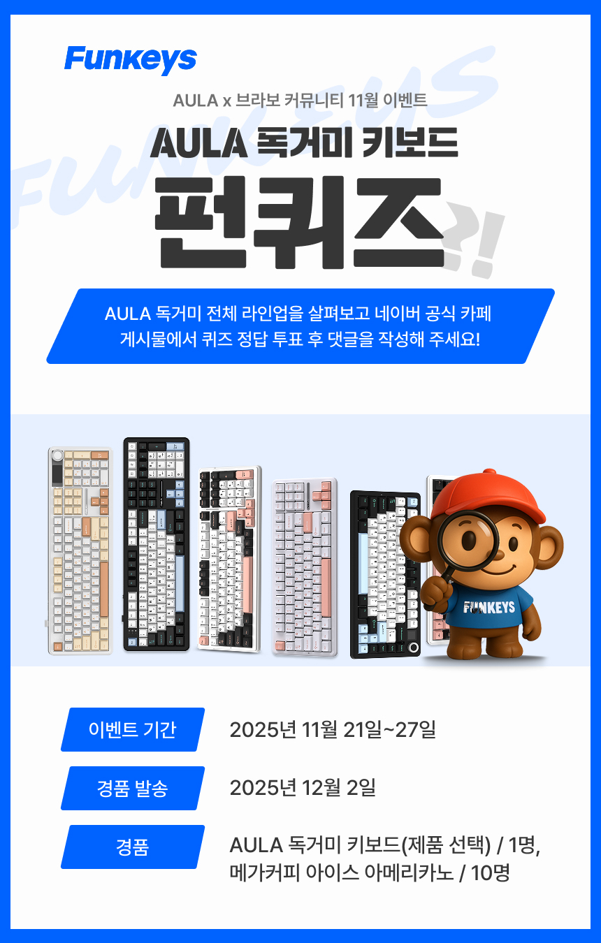 2025년 11월 21일부터 27일까지 진행했던 AULA x 브라보 커뮤니티 11월 이벤트 ‘AULA 독거미 키보드 펀퀴즈?!’ 당첨자를 발표합니다.