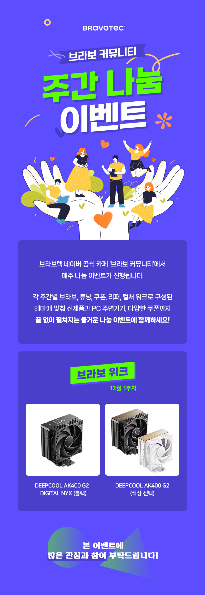 각 주간별 브라보, 튜닝, 쿠폰, 리퍼, 컬쳐 위크로 구성된 테마에 맞춰 신제품과 PC 주변기기, 다양한 쿠폰까지 끝 없이 펼쳐지는 즐거운 나눔 이벤트에 함께하세요!