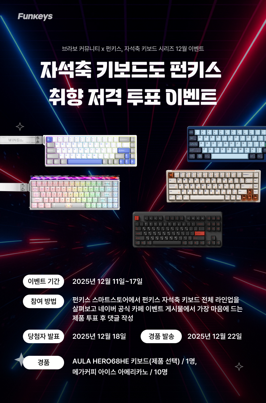 2025년 12월 11일부터 17일까지 브라보 커뮤니티 x 펀키스, 자석축 키보드 시리즈 12월 이벤트 ‘자석축 키보드도 펀키스, 취향 저격 투표 이벤트’ 가 진행됩니다.