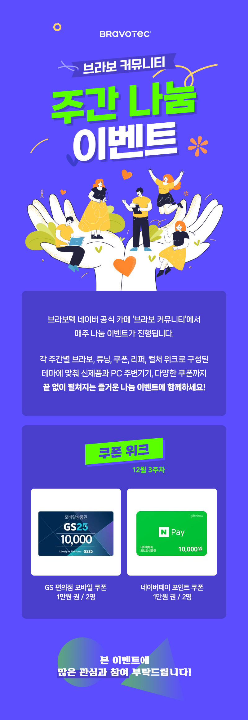 각 주간별 브라보, 튜닝, 쿠폰, 리퍼, 컬쳐 위크로 구성된 테마에 맞춰 신제품과 PC 주변기기, 다양한 쿠폰까지 끝 없이 펼쳐지는 즐거운 나눔 이벤트에 함께하세요!