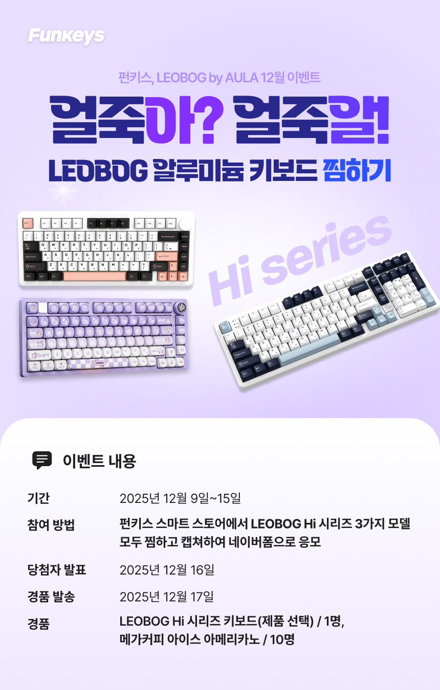2025년 12월 9일부터 15일까지 진행했던 펀키스, LEOBOG by AULA 12월 이벤트 Hi 시리즈 ‘얼죽아? 얼죽알! LEOBOG 알루미늄 키보드 찜하기’ 당첨자를 발표합니다.
