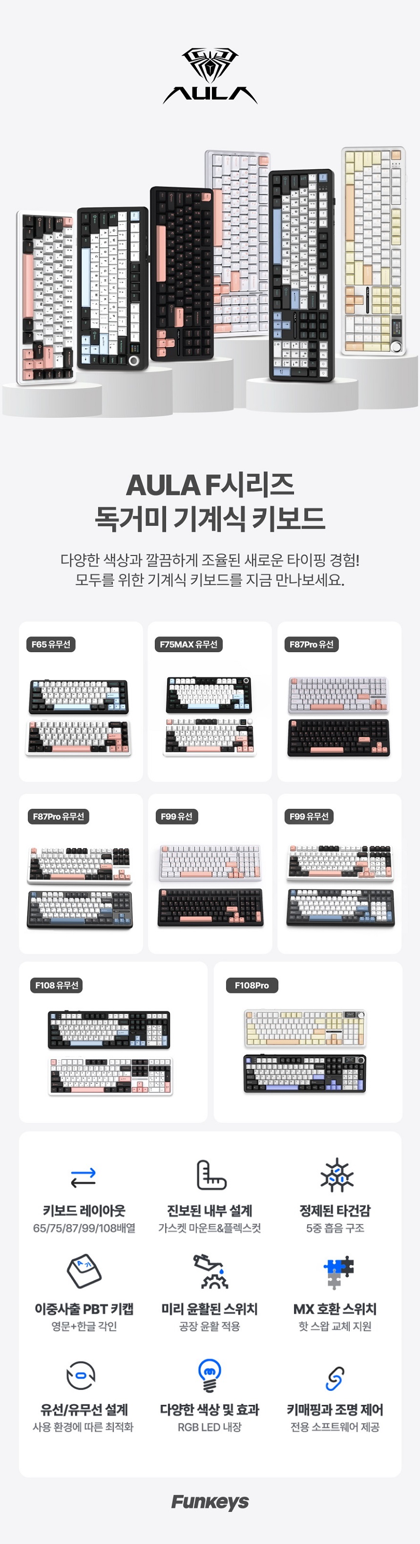 브라보텍의 프리미엄 키보드/마우스 및 액세서리 브랜드 펀키스에서 '독거미'로 전세계 유저들에게 많은 관심을 받고 있는 AULA의 기계식 키보드 F87Pro, F75MAX 유무선 일부 / LEOBOG 저소음솜사탕축 재입고 소식 안내드립니다.