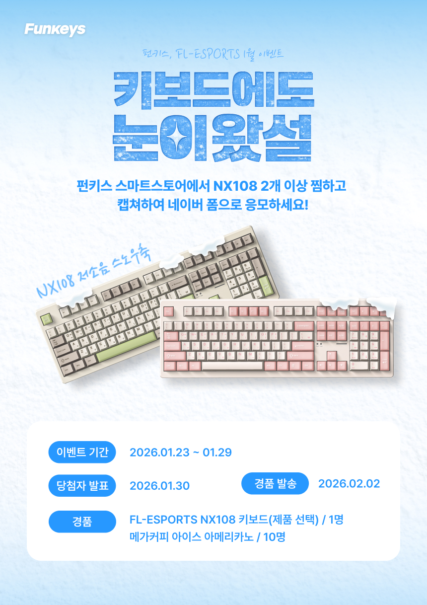 2026년 1월 23일부터 29일까지 펀키스, FL-ESPORTS 1월 이벤트 ‘NX108 저소음 스노우축, 키보드에도 눈이 왔설’ 이 진행됩니다.