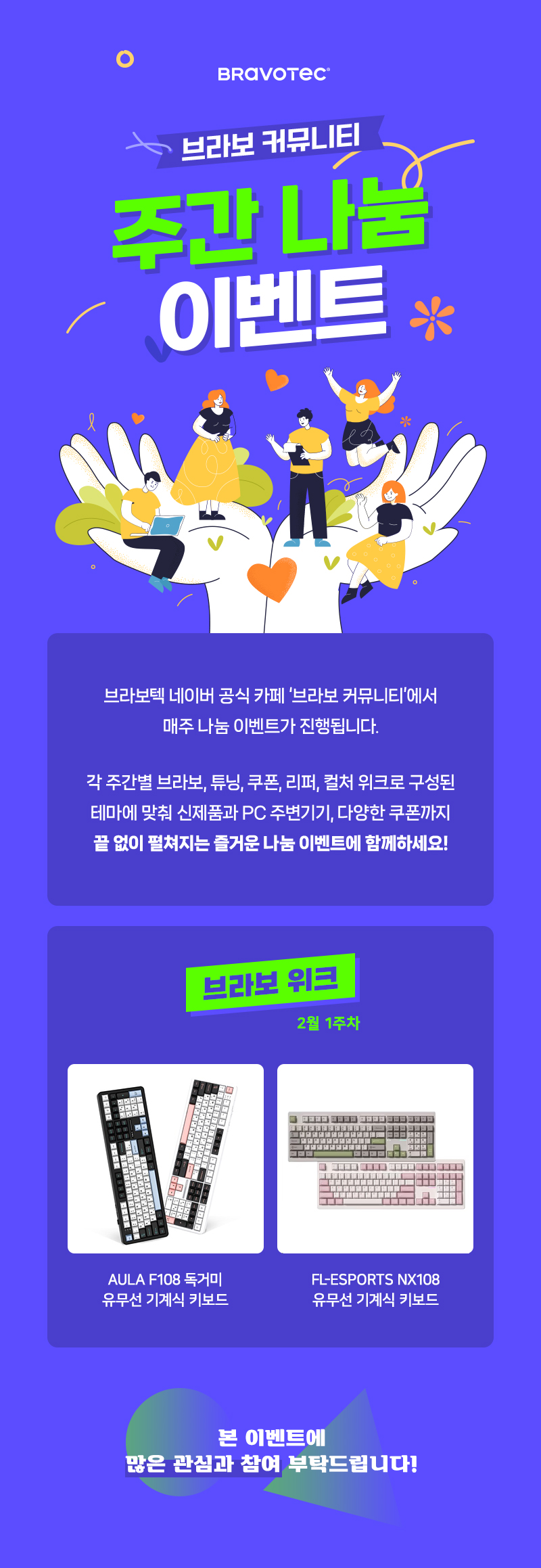 브라보텍 네이버 공식 카페 '브라보 커뮤니티'에서 진행되는 2월 1주차 나눔 이벤트 품목을 안내 드립니다.