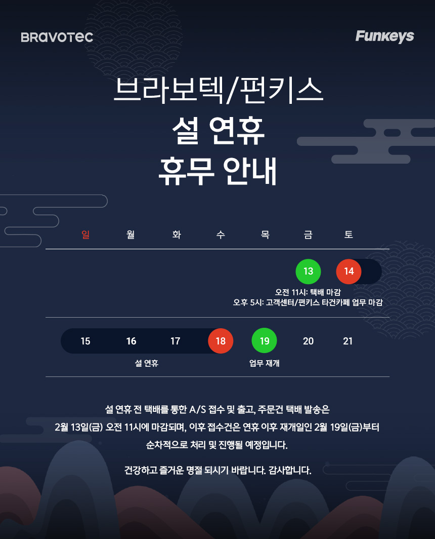 - 브라보텍 고객센터/펀키스 타건카페 업무 마감 : 2026년 2월 13일(금) 오후 5:00 마감