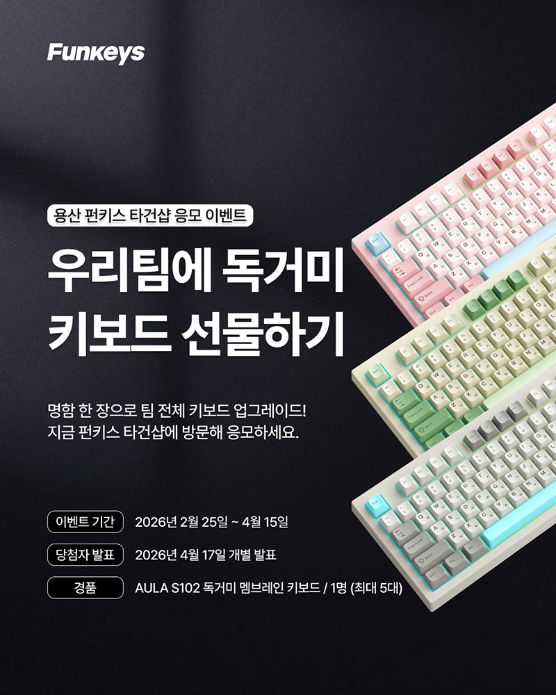 용산 펀키스 타건샵에 방문해 명함을 응모함에 넣어주시면, 추첨을 통해 당첨자 소속 부서 또는 팀 전체에 독거미 멤브레인 키보드를 증정해드립니다.